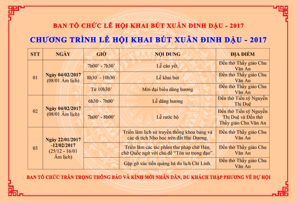 Lễ hội khai bút xuân Đinh Dậu - 2017 tại Đền thờ Thầy giáo Chu Văn An là hoạt động truyền thống, chào mừng xuân mới, tôn vinh đạo Học, truyền thống Tôn sư trọng đạo, Uống nước nhớ nguồn của dân tộc Việt Nam; đẩy mạnh công tác khuyến học, khuyến tài, góp phần thúc đẩy tinh thần hiếu học, xây dựng trí tuệ con người Việt Nam.